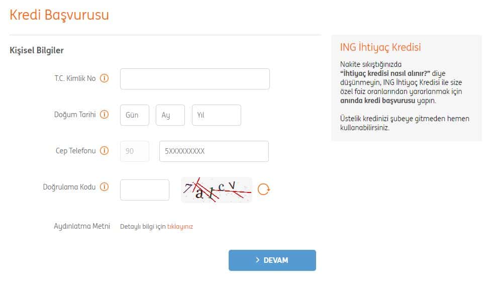 Acil nakit ihtiyacına yönelik kredi veren bankalardan biri de ING Bank’tır. ING Bank, ING Mobil ve web sitesi üzerinden ihtiyaç sahiplerine hızlı bir yollar kredi vermektedir. ING Bank anında kredi başvurusu için,