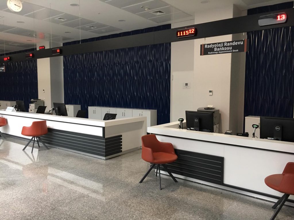 Radyoloji sıramatik sisteminde, kabul bölümüne montajlanan ekranlar, hasta kabul bölümlerinin tamamında olduğu gibi, mimari estetiğe uygun biçimde uygulanmıştır.