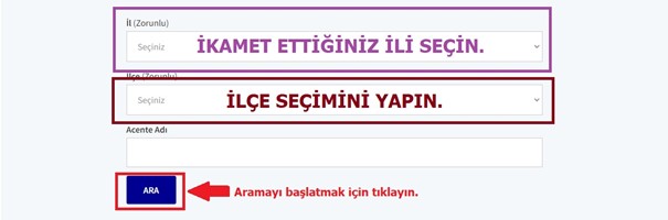 En yakın Axa Sigorta acenteleri şirkete ait web sitesi üzerinden sorgulanabilir. Axa Sigorta web sitesinde yer alan “ Acente Arama ” modülünü kullanarak ikamet ettiğiniz il ve ilçede yer alan şirket acenteleri adreslerine ve iletişim numaralarına ulaşarak hasar dosyası takibi konusunda destek alabilirsiniz. Size en yakın Axa Sigortası aracılığı ile hasar dosyası sorgulamak için takip etmeniz gereken işlem sıralaması şu şekildedir: