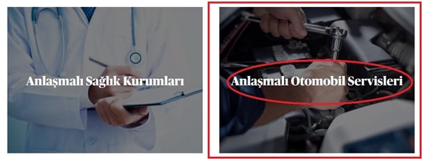 Yapılan seçim sonrası aşağıda gösterildiği şekilde ilgili alanlara poliçe türü, kasko ya da trafik sigortası tipi, araç markası, il ve ilçe bilgilerinin girilerek “ ARA ” butonuna tıklanması yeterlidir. Aşağıda örnek olarak “ Anlaşmalı Otomobil Servisleri” ve “Kasko ” poliçesi için sorgulama yapılmıştır.