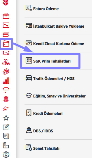 Ziraat Bankası sistemine girdikten sonra menüden “ SGK Prim Tahsilatları ” seçeneğini tercih etmelisiniz.