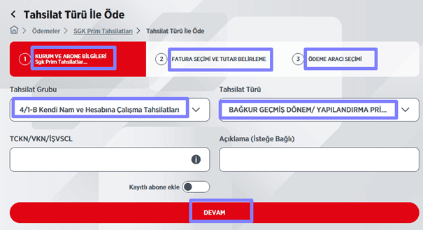 Ardından ödeme aşamasına geçebilirsiniz. Tahsilat grubundan 4B kendi nam ve hesabına çalışmayı seçmelisiniz. Tahsilat türü alanından da BAĞ-KUR geçmiş ya da cari dönemi seçmelisiniz. Ardından tutar belirleyip ödeme aracı seçimine geçebilirsiniz.