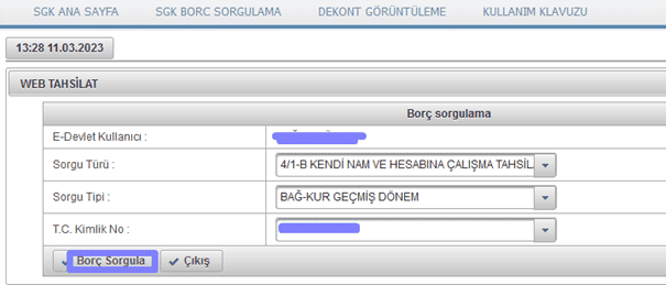 BAĞ-KUR borcu ödeme işlemleri, Sosyal Güvenlik Kurumunun online tahsilat sisteminden yapılabilir. Bunun için ilk önce onlinetahsilat.sgk.gov.tr adresine giriş yapmalısınız. Bu adrese giriş yaptıktan sonra Web Tahsilat kısmından sorgulamayı gerçekleştirebilirsiniz.
