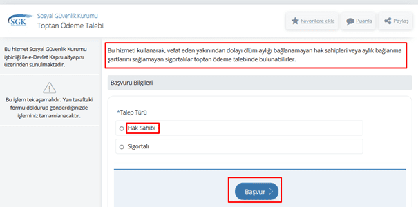 Yukarıdaki ekrandan toptan ödeme başvurusu yapılabilir. Bunun için arama alanına “ Toptan Ödeme Talebi ” yazmak gerekir. Ardından “ Hak Sahibi ” seçeneğine tıklanmalıdır. “Başvur” seçeneğinden müracaat yapılabilir.