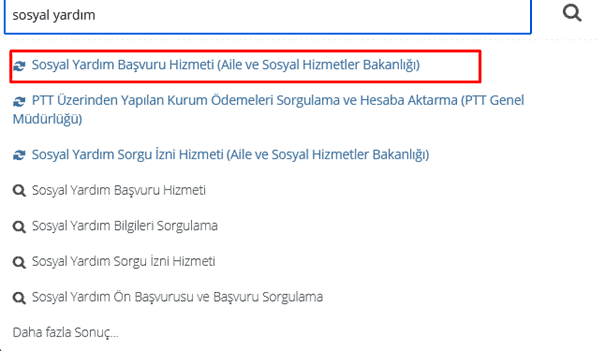 Sisteme giriş yaptıktan sonra arama alanına “Sosyal Yardım” yazarak sosyal yardım sorgulama yapılmalıdır. Sosyal Yardım yazarak sorgulama yaptığınızda karşınıza “Sosyal Yardım Başvuru Hizmeti” seçeneği çıkar.