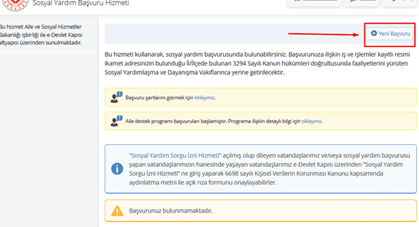 Bu seçeneğe tıklayarak Aile ve Sosyal Hizmetler Bakanlığından sosyal yardım başvurusu yapabilirsiniz. Bu başvuru, genel bir nitelik taşır. Sosyal yardım başvurunuz onaylandığı takdirde verilen tüm sosyal yardımlardan yararlanma şansınız olur. Ancak formu dikkatli bir şekilde doldurmanız önemlidir.
