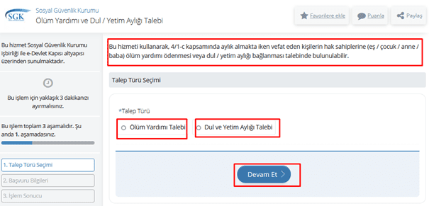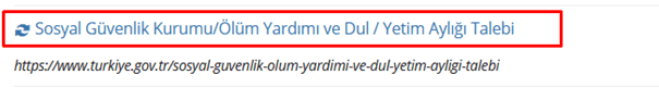 Arama alanına “ Ölüm ” yazarak ölüm aylığı ile ilgili başvuru kısımlarına ulaşılabilir. Ölüm yardımı, yetim aylığı talebi kısmından başvuru yapılabilir. Ancak bu kısımdan sadece 4c kapsamında aylık almaktayken vefat edenlerin eşleri, çocukları başvuru yapabilir.