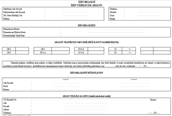 EK 33 A belgesi bir izin belgesi niteliği taşır. Bu belge trafik polislerinin yol denetimi yapan trafik polislerine gösterilmelidir. Belgede izin verilecek araca ait bilgiler yer alır. Belge; araç sahibi, sürücüsü ya da araç sahibinin vekili adına düzenlenebilir.