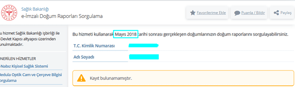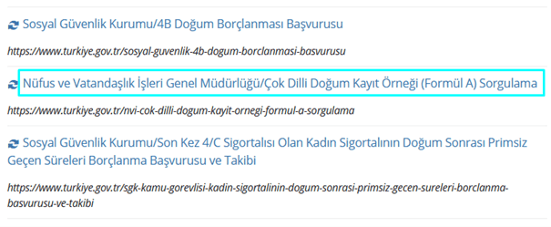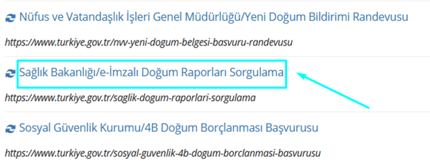 Çıkan seçenekler arasından “ Sağlık Bakanlığı/e-imzalı Doğum Raporları Sorgulama ” seçeneğini tercih etmelisiniz.