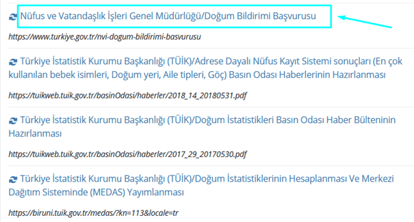 E-Devlet’ten doğum bildirimi başvurusu yapmak için arama alanına doğum bildirimi yazmalısınız. Çıkan sonuçlar arasından “Doğum Bildirimi Başvurusu” seçeneğini tercih etmelisiniz.