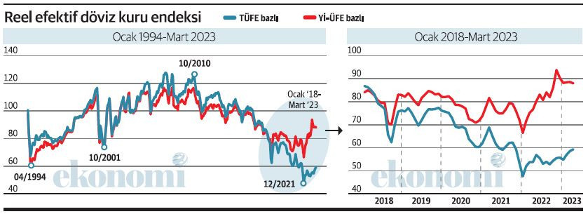TÜFE ve Yİ-ÜFE bazlı reel kur endeksleri 2003 yılı 100 esas kabul edilerek oluşturuluyor ve mart ayındaki son duruma göre TÜFE bazlı endeks 59.38, Yİ-ÜFE bazlı endeks ise 87.97 düzeyinde.