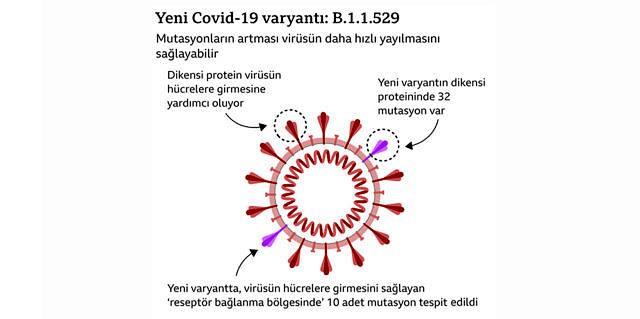 Bu çıkıntılar virüsün vücuttaki sağlıklı hücrelere girebilmesinde hayati rol oynuyor ve bu nedenle mevcut koronavirüs aşıları bu çıkıntıları etkisizleştirmeyi hedefliyor. Virüsün bizim sağlıklı hücrelerimizle ilk temasını sağlayan kısımlarına iyice yakından bakıldığında bu bölümde orijinal virüse göre 10 farklı mutasyon olduğu görülüyor. Oysa dünyada en son hızla yayılan Delta varyantının bu kısmında sadece iki mutasyon vardı. Öte yandan her mutasyon mutlaka olumsuz olmayabilir. Önemli olan mutasyonların tam olarak neye yaradığını anlayabilmek.