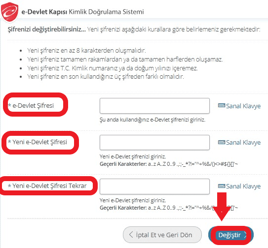 eDevlet şifre değiştirme ve yenileme için önce eski şifrenizi girmelisiniz. Ardından verilen iki ayrı satıra yeni şifrenizi yazmalısınız. Ardından “ Değiştir ” yazan yere tıklamalısınız.