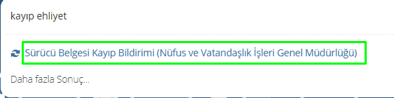 Ardından arama alanına “ Kayıp Ehliyet ” yazılmalıdır. “ Sürücü Belgesi Kayıp Bildirimi ” yazan seçeneğe tıklanır.