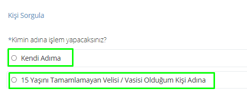 Gelen ekranda kimin adına işlem yapacağınız sorulur. Buradan kendi adınıza işlem yapabilirsiniz. Bunun yanı sıra 15 yaşından küçük çocuklarınız için de işlem yapma şansınız vardır.