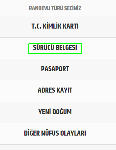 Sağlık raporu alındıktan sonra sürücü belgesi randevusu alınmalıdır. Randevu, Nüfus ve Vatandaşlık İşleri Müdürlüğü internet sitesinden alınabilir. İlk olarak randevu.nvi.gov.tr adresine girilmelidir.