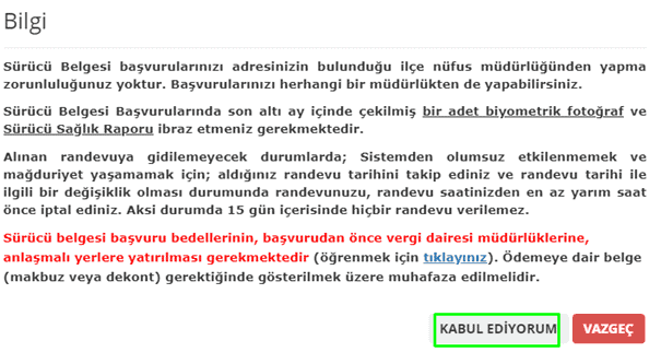 Gelen ekranda randevunun hangi amaçla alınacağı tercih edilir. Kimlik kartı, sürücü belgesi randevuları buradan alınabilir. Sürücü belgesi seçeneği tercih edildikten sonra gelen ekranda “ Kabul ediyorum ” yazan kısma tıklanmalıdır.