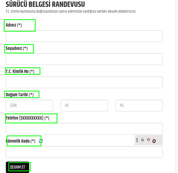 Yukarıda gösterilen alanlara tüm bilgiler eksiksiz şekilde girilmelidir. Ardından “Devam Et” yazan alana tıklanmalıdır. Devamında ekranda çıkan yönergeler takip edilmelidir. Herhangi bir nüfus müdürlüğünden randevu alınabilir.