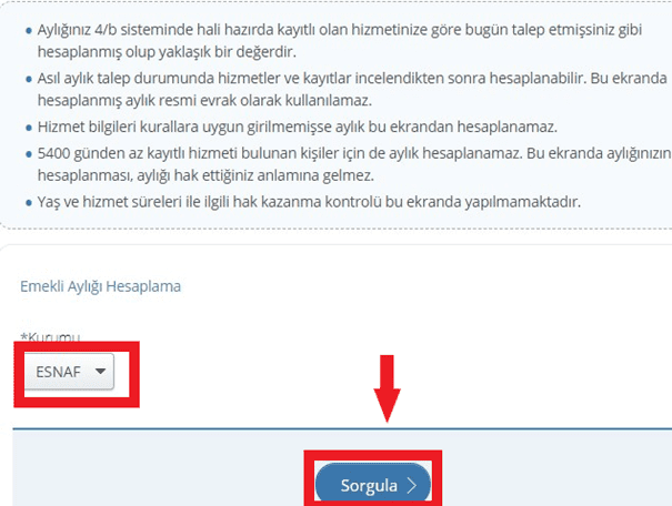 “ 4B emekli aylığı hesaplama-Sosyal Güvenlik Kurumu ” yazan kısımdan hesaplama alanına ulaşabilirsiniz. Hesaplama alanında size esnaf ve tarım şeklinde iki seçenek sunulur. Bu seçeneklerden uygun olanı tercih etmelisiniz. Ardınsan “Sorgula” seçeneğine tıklayarak sonucu öğrenebilirsiniz.