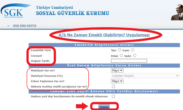 BAĞ-KUR emekli maaşı hesaplama işlemi e-Devlet’te yer alan tablo üzerinden gerçekleştirilir. Aynı zamanda “ 4/b Ne Zaman Emekli Olabilirim ” adresinden emeklilik zamanını da öğrenebilirsiniz. Bu adrese girdikten sonra tabloda yer alan bilgileri doldurmalısınız.