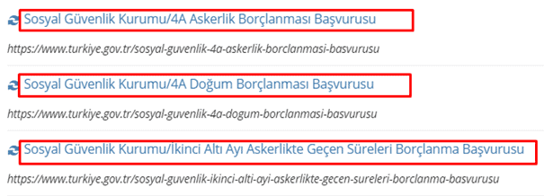 Borçlanma başvurusu e-Devlet üzerinden yapılabilir. E-Devlet sistemine girdikten sonra arama alanına borçlanma yazarak sorgulama yapılır. Yukarıdaki ekranda gösterilen seçenekler arasından uygun seçenek tercih edilir.