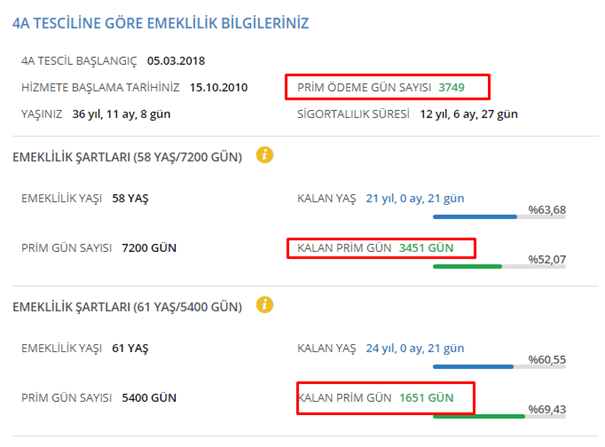 Yukarıdaki ekranda sigortalının 3451 gün daha prim ödemesi gerektiği belirtiliyor. Burada 58 yaş 7200 güne; 61 yaş 5400 güne göre hesaplama yapılıyor. Sigortalının emekli olması için hem yaş hem de prim şartını sağlaması gerekiyor.