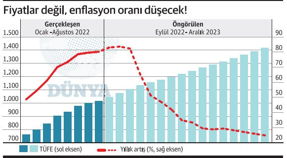 Ağustosta 1016 olan TÜFE, yani ortalama fiyat düzeyi aralıkta 1133’e çıkacak. Yıllık enflasyon oranının hızla gerileyip yüzde 24.9’a ineceği öngörülen 2023’ün sonundaki ortalama fiyat düzeyi ise 1416 olacak.