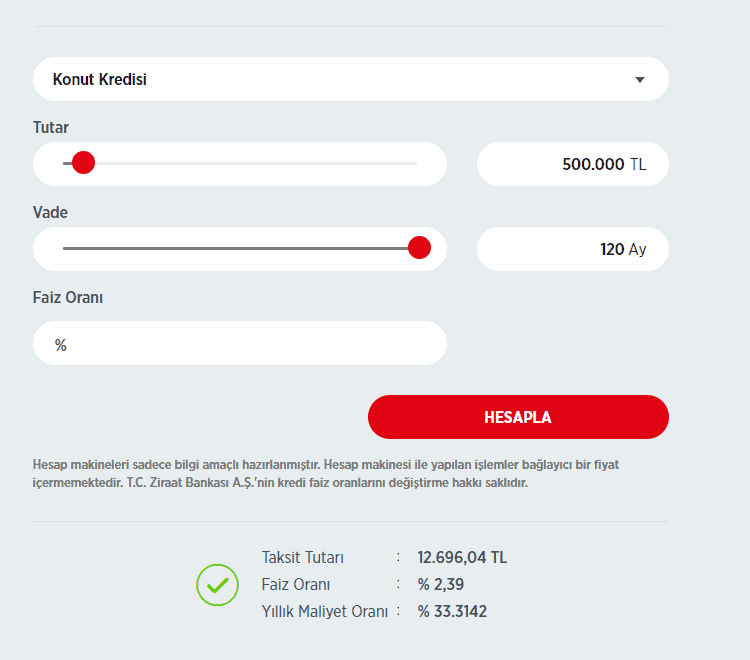 Ziraat bankasından 500,00 TL engelli konut kredisi almak istediğinizde %2,39 faiz oranı ile kredi alabilir ve aylık 12.696,04 TL taksitlendirebilirsiniz.