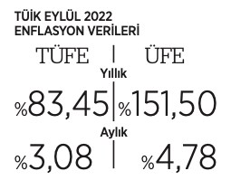 TÜİK’in yayımladığı eylül ayı tüketici fiyat endeksindeki (TÜFE) yıllık artış yüzde 83,4 aylık artış ise yüzde 3,08 oldu. Resmi enflasyon 1998 yılından bu yana en yüksek seviyeye çıkarken AKP Aralık 2002’de yüzde 29,7 ile devraldığı enflasyonu 20 yıl sonra 83,4’e yükseltti.