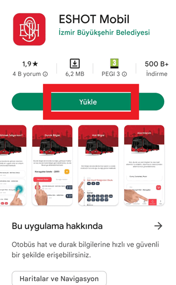 Telefonunuzun Play Store ya da App Store kısmına girdikten sonra arama bölümüne ESHOT yazarak uygulamaya ulaşabilirsiniz. Uygulamayı telefonunuza indirmek için “ Yükle ” butonuna basmanız gerekir. Yükleme işlemi tamamlandıktan sonra karşınıza aşağıdaki ekran gelir.