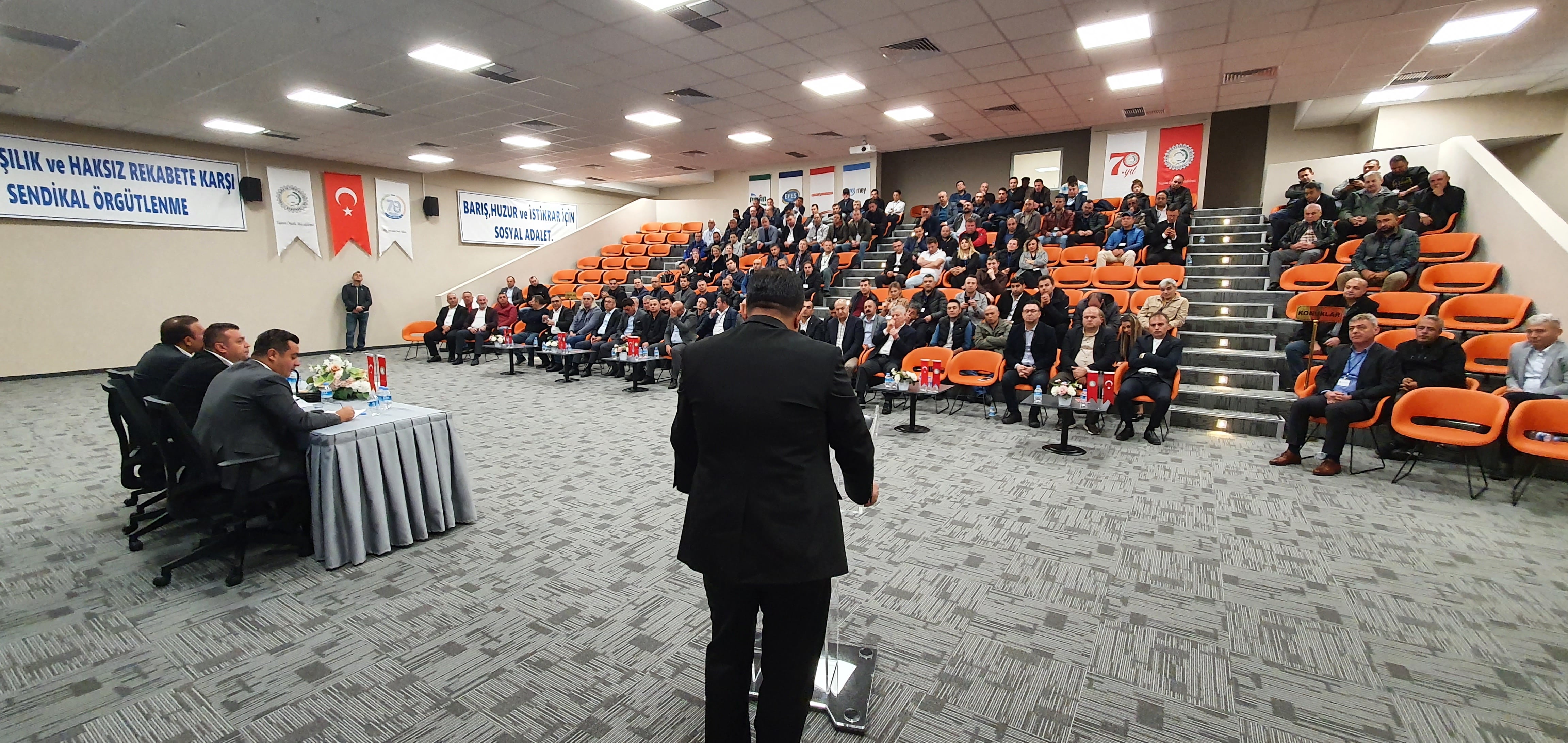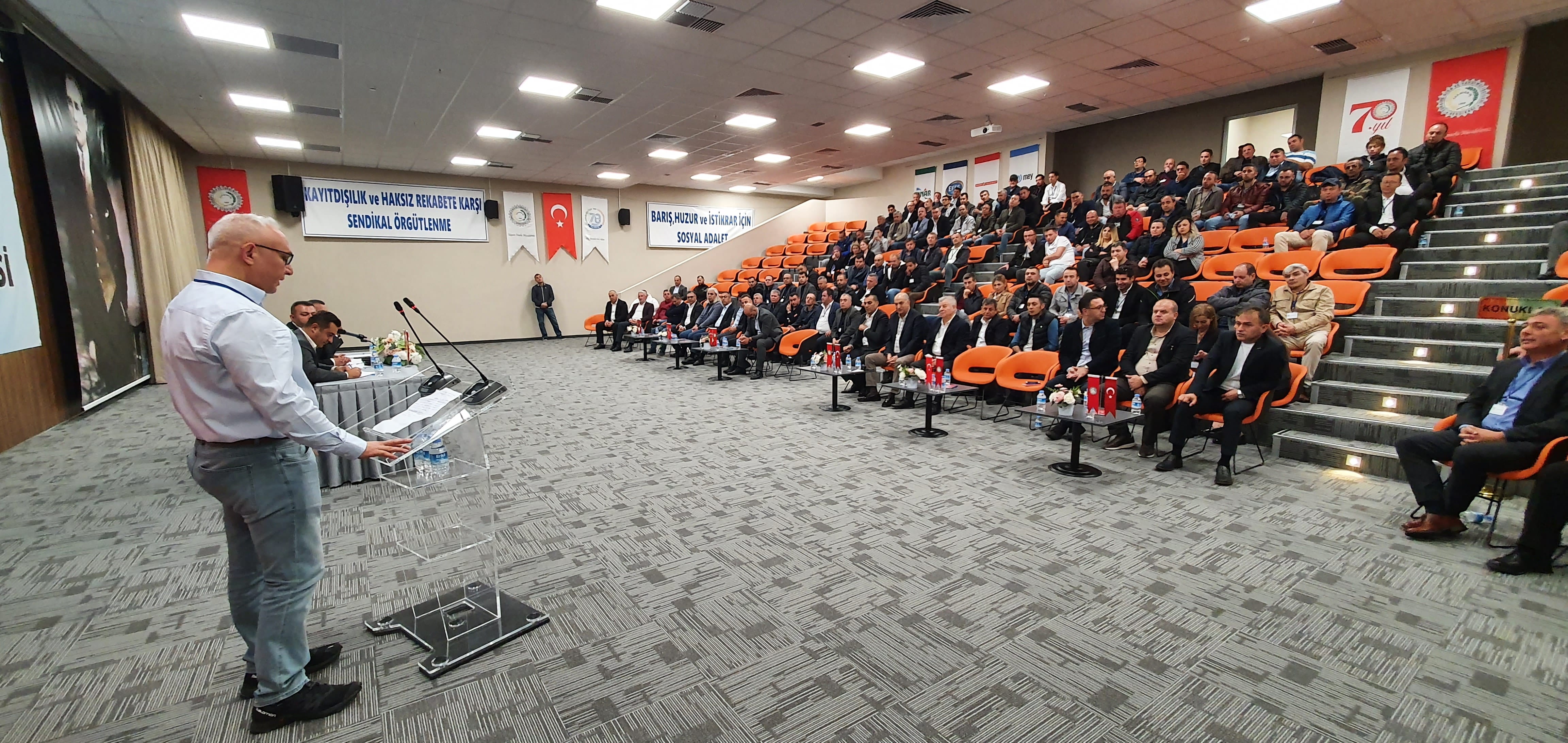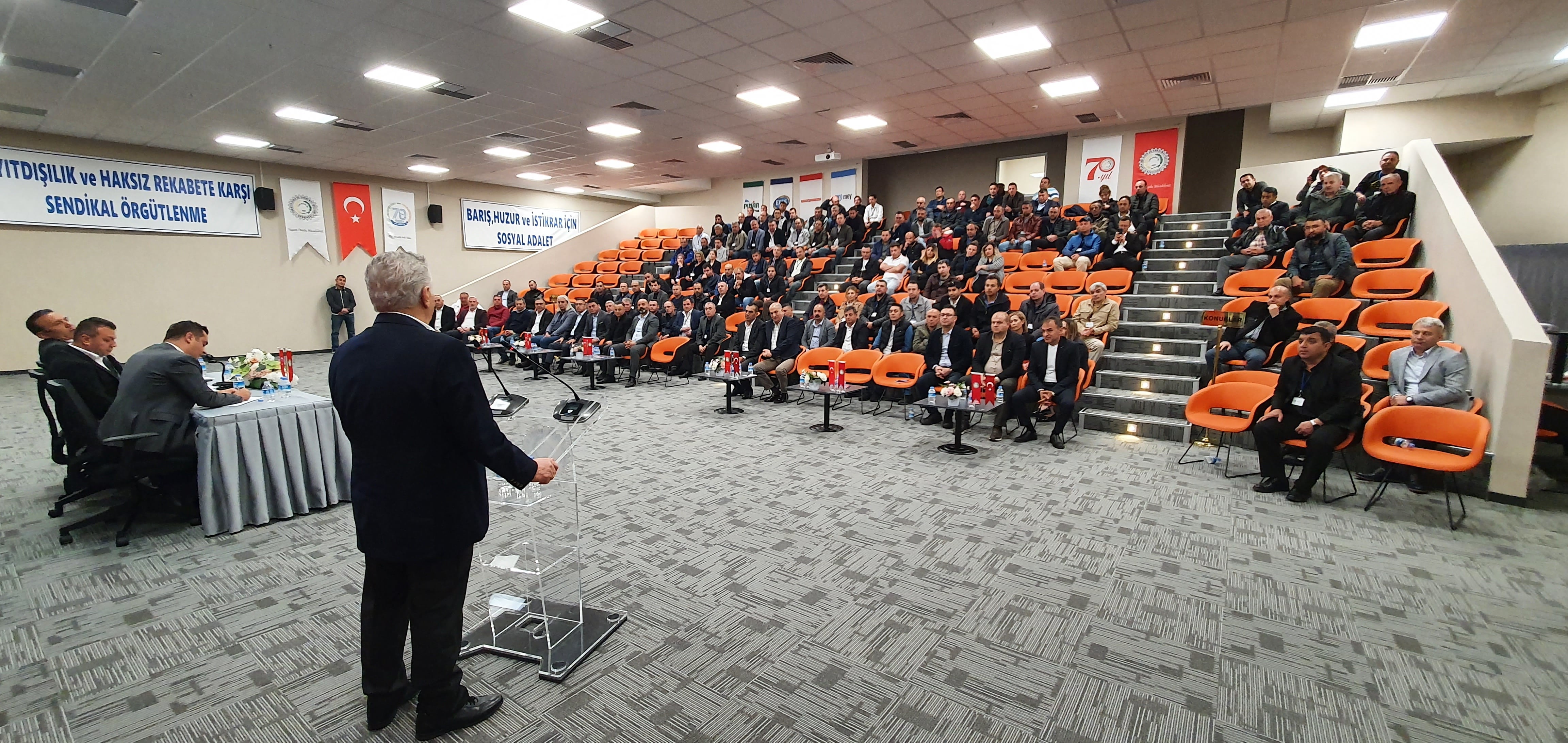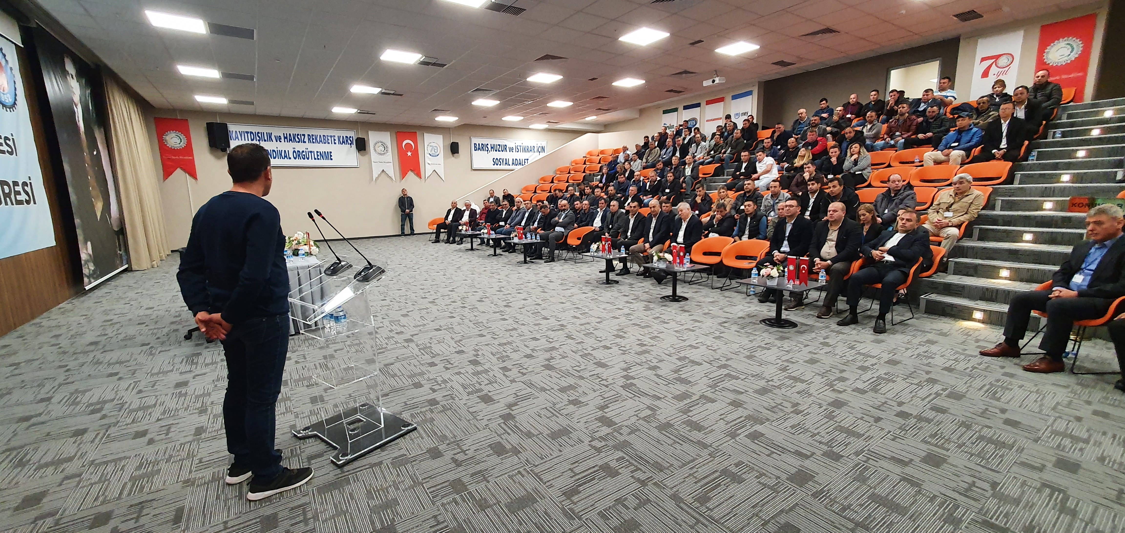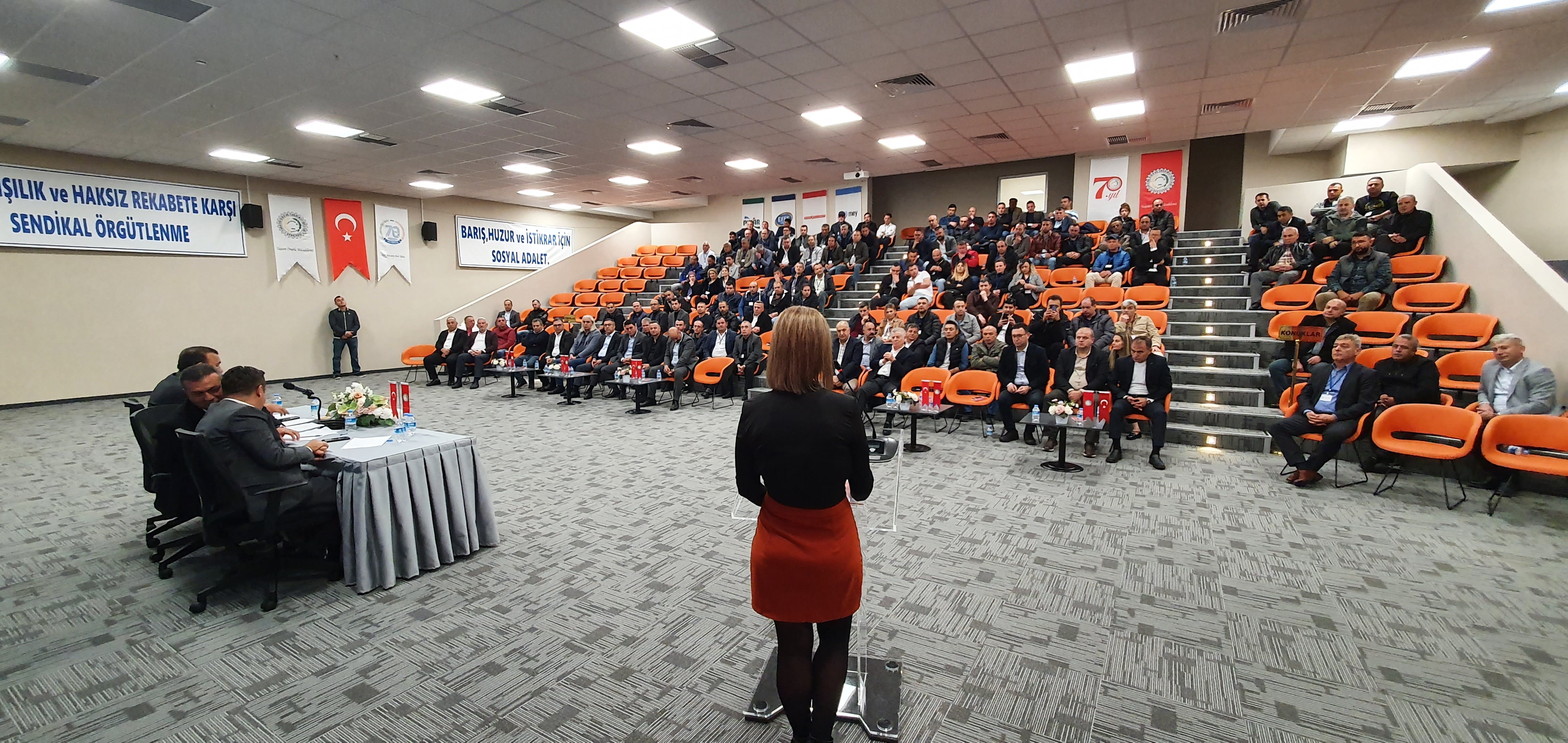 Delegelerin konuşmasının ardından bir konuşma yapan Genel Başkanımız Mustafa Türkel, ülkemizin içinde bulunduğu ekonomik ve siyasi durumu, bunun çalışanlara yansımalarını, asgari ücret artışını ve bunun toplu sözleşmelere etkileri de dahil çalışma hayatının gündemindeki konuları değerlendirdi.
