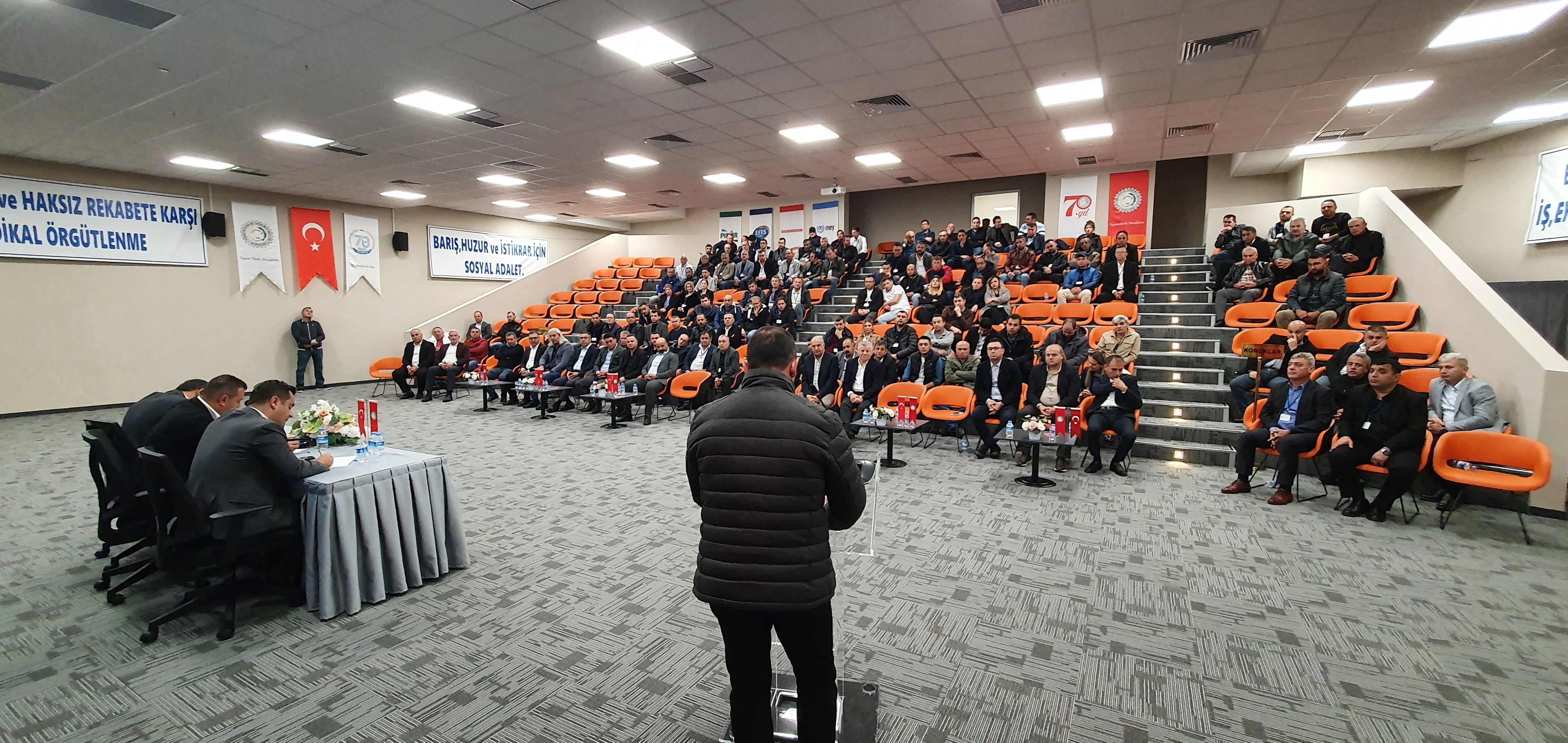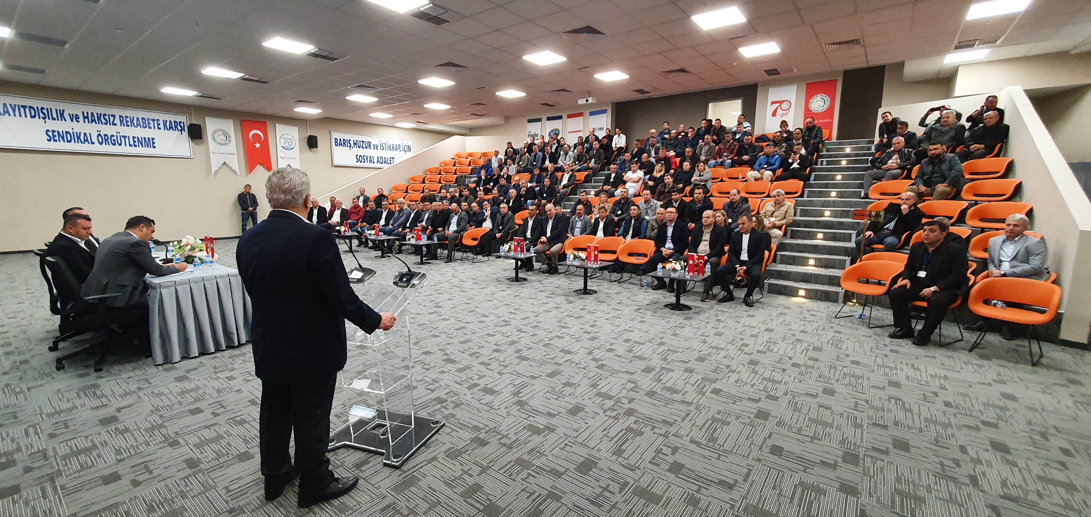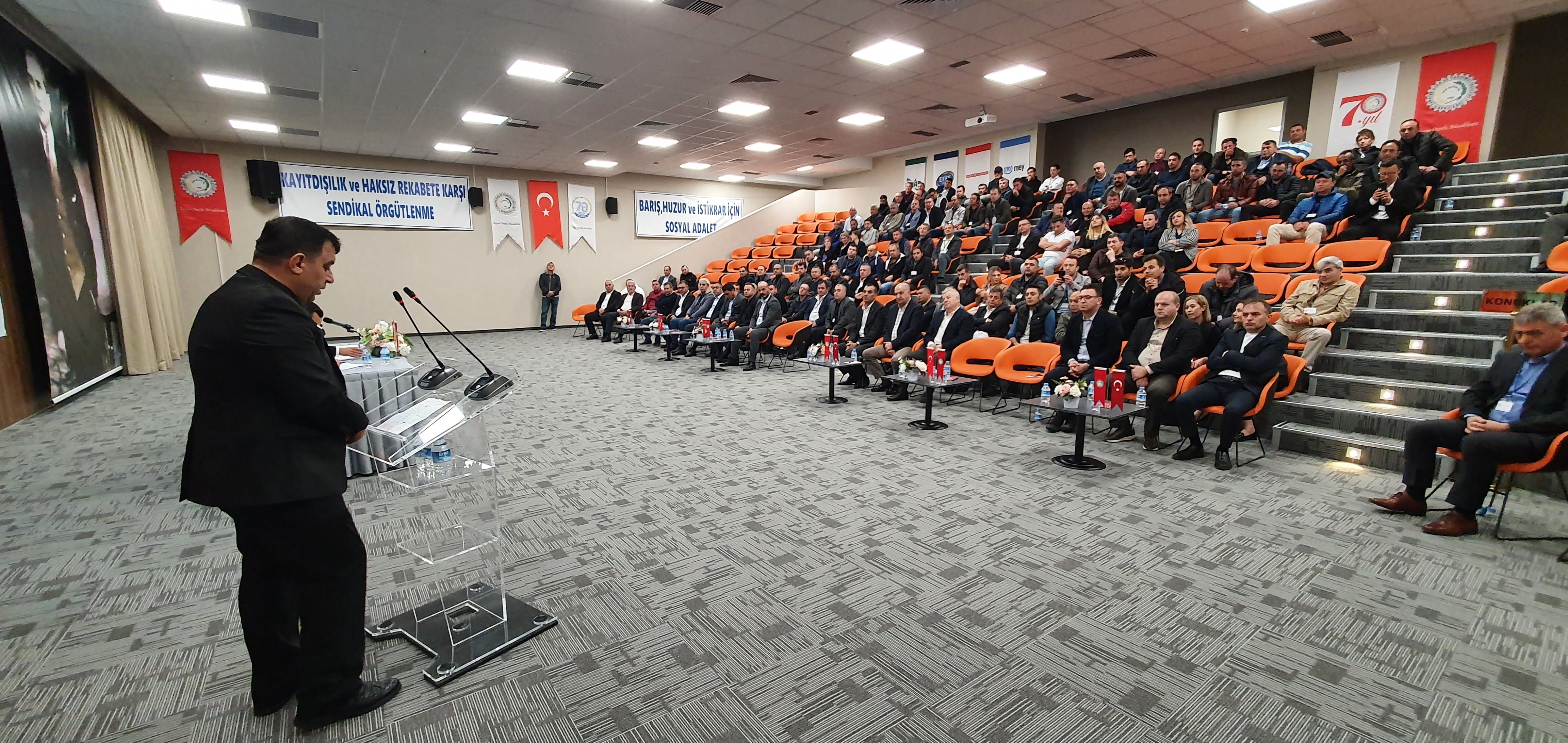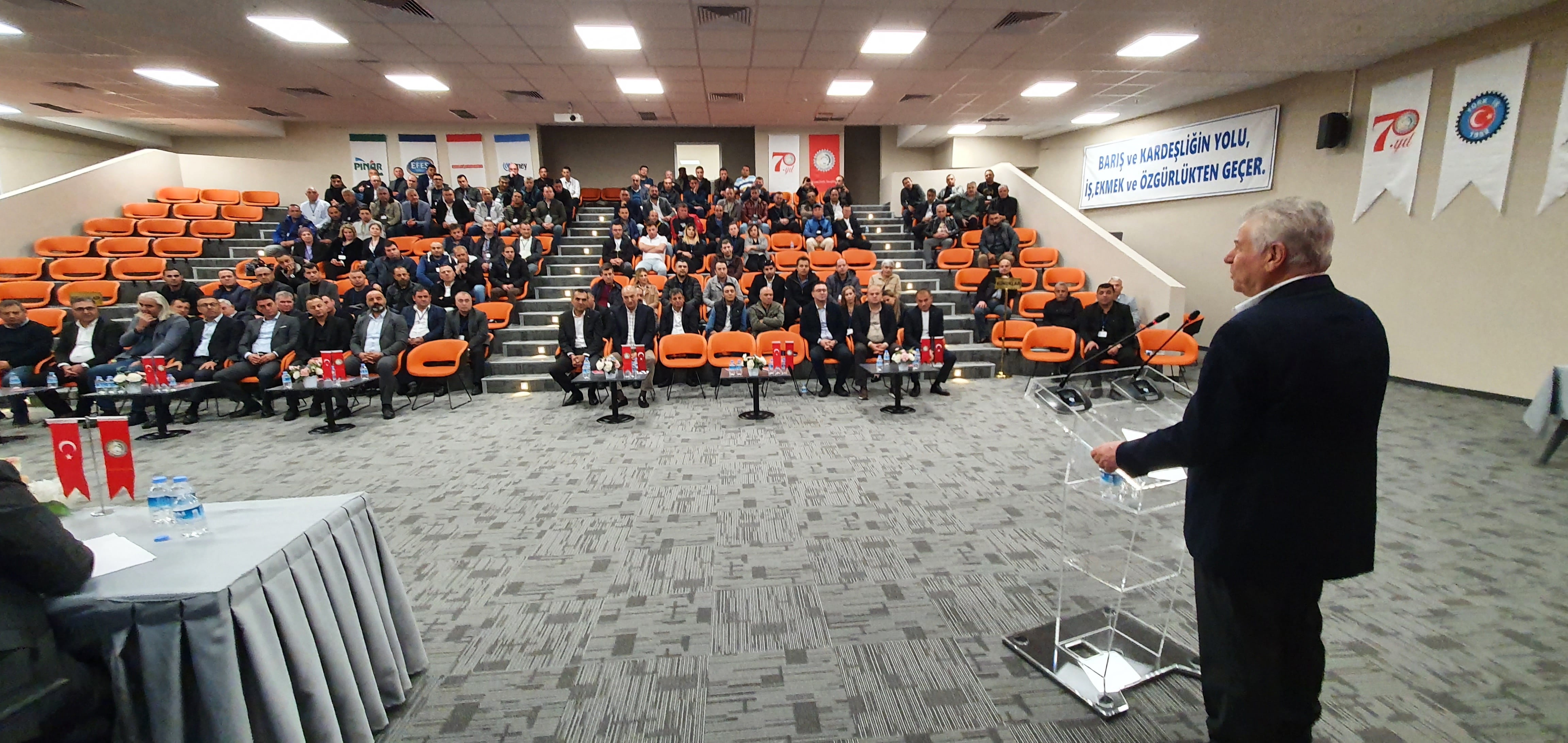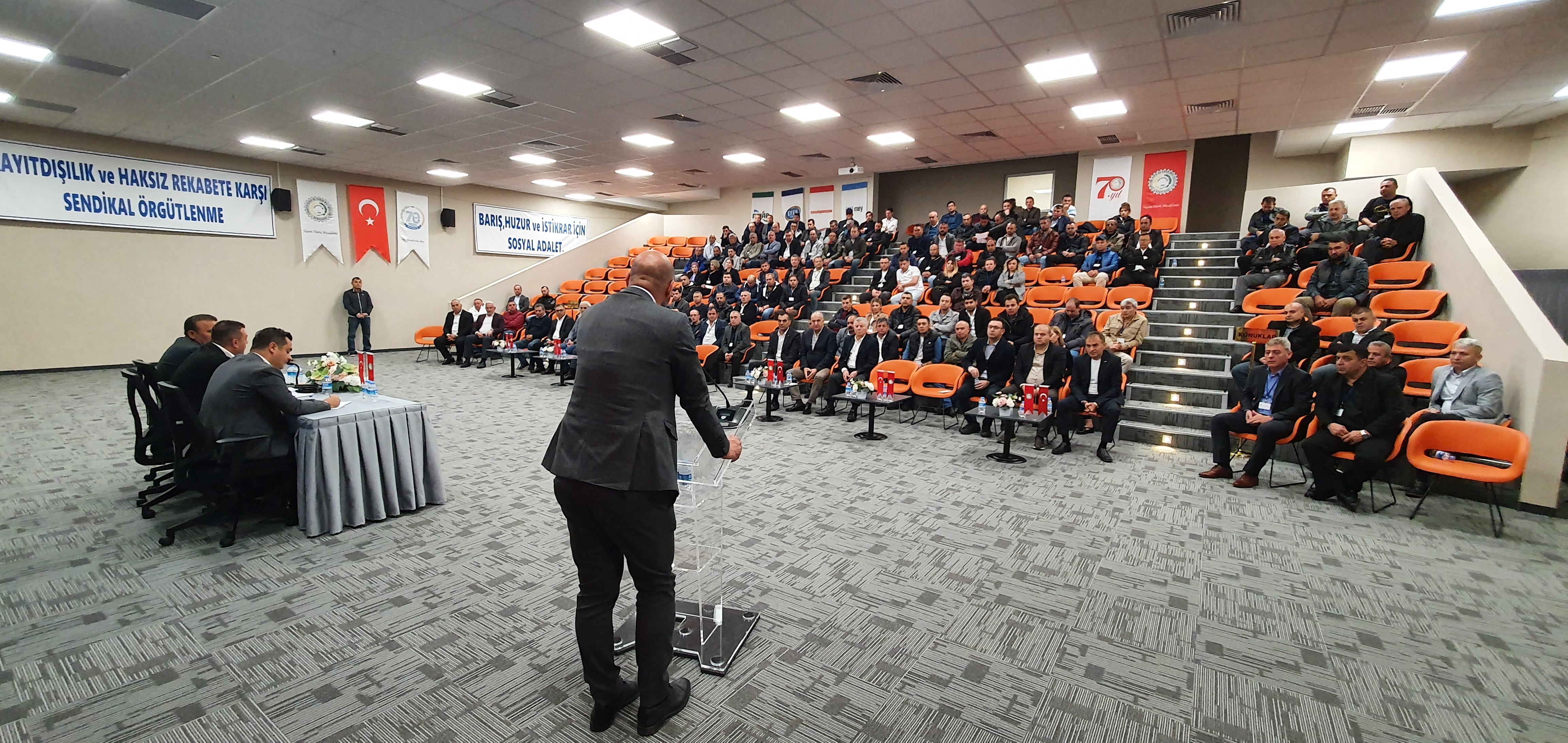 Delegelerin konuşmasının ardından bir konuşma yapan Genel Başkanımız Mustafa Türkel, ülkemizin içinde bulunduğu ekonomik ve siyasi durumu, bunun çalışanlara yansımalarını, asgari ücret artışını ve bunun toplu sözleşmelere etkileri de dahil çalışma hayatının gündemindeki konuları değerlendirdi.