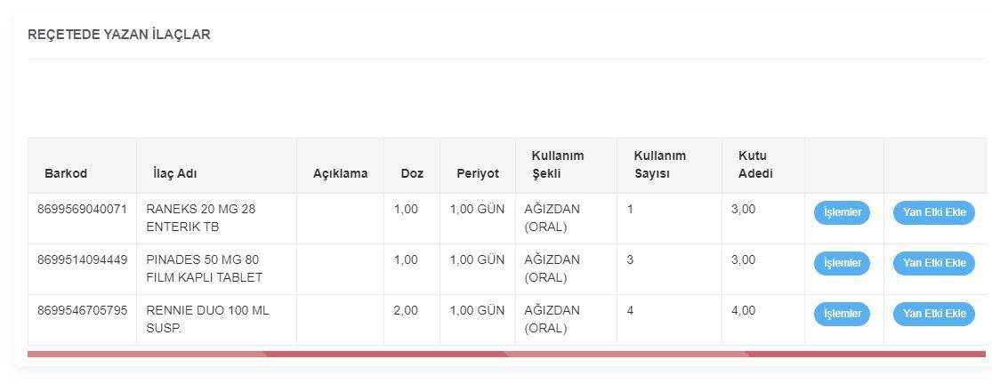 Bu kısımda sağ yanda mavi renkle yazılan “ Yan etki ekle ” seçeneği tıklanarak kişiler dilerse ilacın kendilerinde oluşturduğu etkileri de not edebilirler. Burada verilen yan etki bilgileri hem ilaç firmalarına referans oluşturuyor hem de sonraki doktor randevularında doktorların bu yan etkilerden haberdar olmasını sağlıyor. Bu sayede aynı ilacın tekrar yazılması gereken bir durum olduğunda doktora önceki kullanımda oluşan yan etkilerin söylenmesi unutulsa bile doktorun haberi olması garanti altına alınmış oluyor.