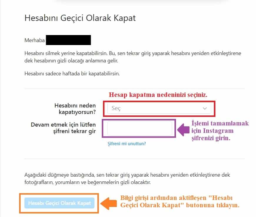 Geçici olarak Instagram hesabınızı kapatmak istediğiniz takip etmeniz gereken işlem sırası aşağıdaki gibidir: