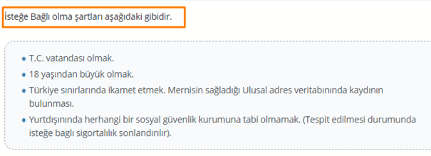 Bu seçeneği tercih ettikten sonra hangi şartların gerektiği ekranda belirtilir. Bu ekranda belirtilen şartları taşıyanlar, 4B’li isteğe bağlı sigortalı olabilir.