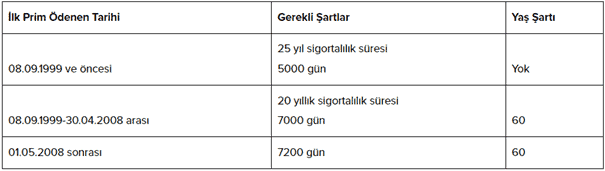 Tabloda görüldüğü üzere 1999 sonrası sigortalı olanlar daha fazla prim ödemek zorundadır. Aynı zamanda yaş şartı da sağlanmalıdır.