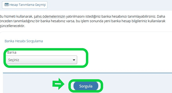 Yukarıda gösterilen alandan banka seçiminizi yapmanız gerekir. Banka seçimini yaptıktan sonra karşınıza hesap numaranız otomatik olarak çıkar. Farklı bankalarda hesabınız varsa bunların arasından birini tercih ederek geçici iş göremezlik ödeneğinin oraya yatmasını sağlayabilirsiniz.