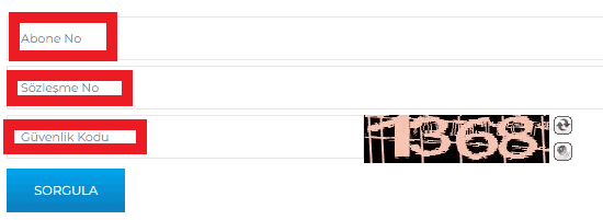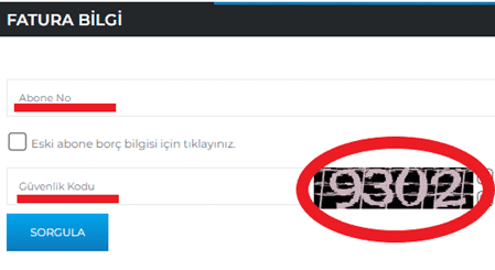 “Fatura Bilgi” kısmına tıkladığınızda karşınıza “Abone No” ve “Güvenlik Kodu” kısmının yer aldığı sorgulama ekranı gelir. Abone No bölümüne faturanızda yer alan numarayı girmeli ve ardından ekrandaki 5 haneli güvenlik kodunu yazmalısınız.