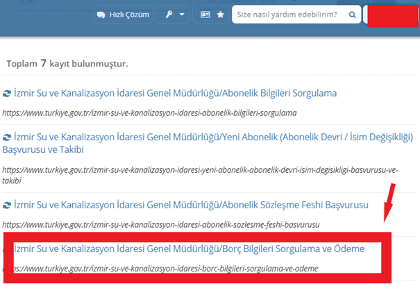 Giriş işlemini tamamladıktan sonra arama kısmına İZSU yazarak kurumun E-Devlet’te bulunan sayfasına ulaşmalısınız.
