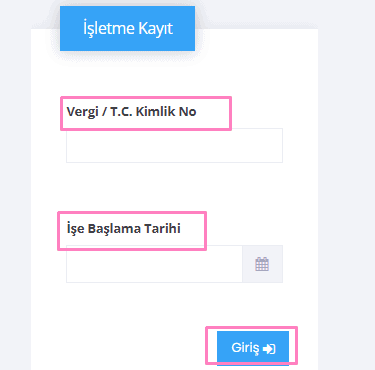 Gelen ekranda ilk olarak vergi kimlik ya da T.C. kimlik numarası girilmelidir. Ardından işe başlama tarihi girilmelidir ve “ Giriş ” yazan alana tıklanmalıdır.
