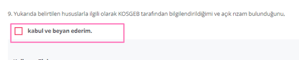 Destek başvurusu öncesinde rıza metnini onaylamanız gerekir. Bunun için “ kabul ve beyan ederim ” kısmını işaretlemelisiniz.