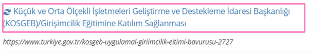 e-Devlet üzerinden girişimcilik eğitimine katılım için başvuru yapılabilir. Bunun için “ Girişimcilik Eğitimine Katılım Sağlanması ” seçeneğine tıklanmalıdır.