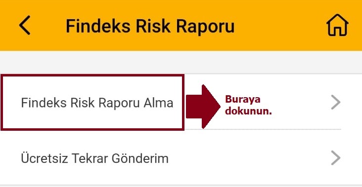 Yukarıda tamamlanan işlem ardından, aşağıda gösterildiği şekilde “Findeks Risk Raporu Alma” sekmesine dokunarak işleme devam edin.