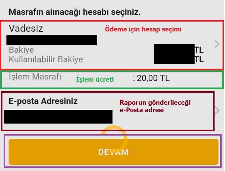 Yukarıdaki işlemi tamamlamanın ardından işlem ücretini ödeyerek kredi skorunuzu öğrenebilirsiniz . İşlem ücreti için aşağıda gösterildiği şekilde vadesiz hesap seçimini yaparak “ Devam ” butonuna dokunmanız yeterlidir. Raporunuz, ödeme işlemi sırasında belirttiğiniz e-Posta adresine gönderilir.