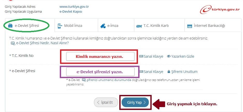 Yukarıda gösterildiği şekilde başlatılan süreçte, aşağıda gösterildiği şekilde kimlik doğrulama yapılması gereklidir. Aşağıda paylaşılan görselde, e-Devlet şifresi ile girişin nasıl yapılacağı gösterilmiştir.