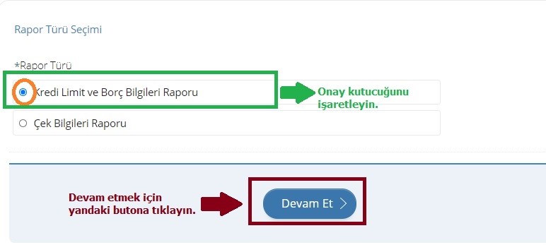 Yeni başvurunun başlatılması ardından, yapılması istenen işlem tipinin seçilmesi gereklidir. Turuncu daire ile gösterilen “ Kredi Limit ve Borç Bilgileri Raporu ” kutucuğu işaretlenerek “ Devam Et ” butonuna basılır ve işleme devam edilir.