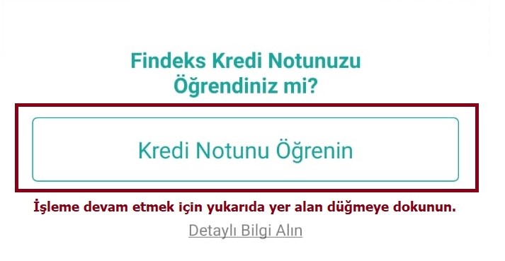 Cep telefonunuza gelen SMS’te yer alan şifreyi girerek ve “ Devam ” butonuna tıklayarak uygulamaya giriş yapabilirsiniz. Açılan uygulamada aşağıda gösterildiği şekilde “ Kredi Notunu Öğrenin ” düğmesine dokunarak sorgulama yapabilirsiniz.