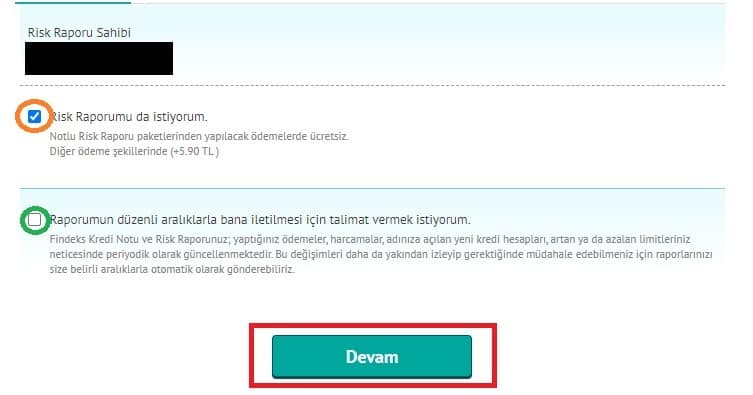Açılan sayfada aşağıda gösterildiği şekilde kredi skoru öğrenme ücreti için ödeme işlemini tamamlamanız gereklidir. Aşağıda gösterildiği şekilde tercihe bağlı olarak risk raporunu seçerek “Devam” tuşuna basın.