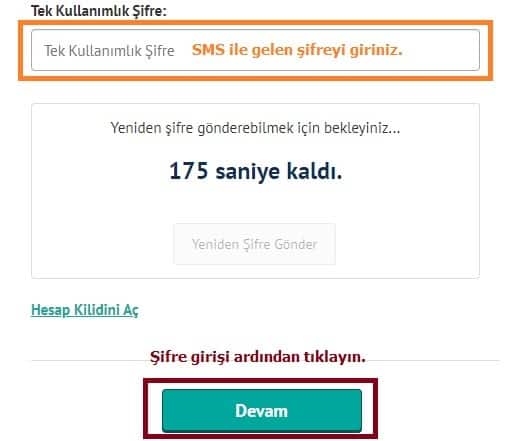 Yukarıda gösterildiği şekilde yapılan giriş işlemleri ardından, Findeks’e kayıtlı cep telefonunuza kısa mesaj gelir . Kısa mesajda gönderilen doğrulama kodunu aşağıda gösterildiği şekilde ilgili alana girin ve “ Devam ” butonuna tıklayarak Findeks internet şubesine ulaşın.