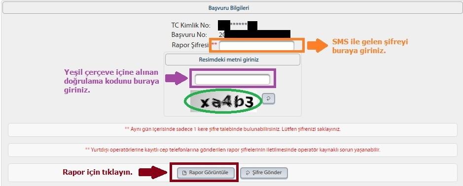 Tıklamanız ardından başvurunuz tamamlanır ve tarafınıza kısa mesaj ile başvurunuza ait numara ve şifre gönderilir. Oluşturulan rapora ulaşmak için SMS ile gönderilen şifreye ihtiyacınız bulunmaktadır. Şifreyi aşağıda gösterilen alandan temin edebilirsiniz.